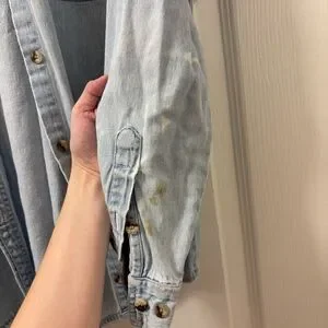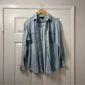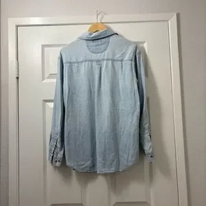 Classic denim blue shirt with button-down front. Perfect for casual outings. Some wear but overall great used condition.