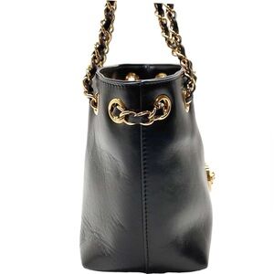 Chic Versace shoulder bag in sleek black. Features elegant gold chain straps. Iconic emblem for a stylish touch.