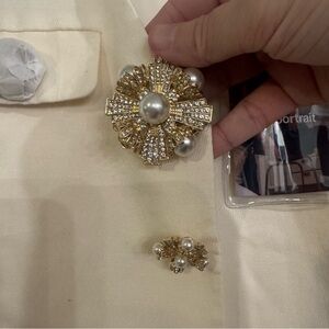 Life's a breeze in this cream linen midi which falls to an elegant midi length. Gold, pearl & diamanté buttons and brooches elevate the timeless silhouette. Ideal for desk to dinner dressing.