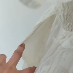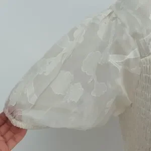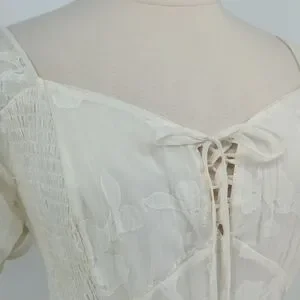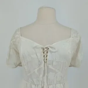Chic cream dress with lace-up front, pockets, smock details. Features delicate floral patterns and short sleeves.