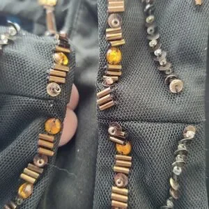 100% silk. See pic of side mark from zipper. May be missing 3 beads on right shoulder seam (left shown in pic) but no loose threads to confirm.