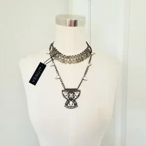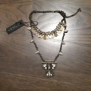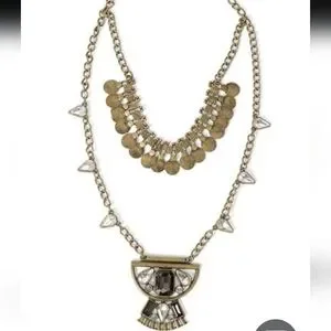 Layered necklaces are IN! This versatile necklace features a short coin detail layer with a longer pendant that is made luxe with jewel embellishments.