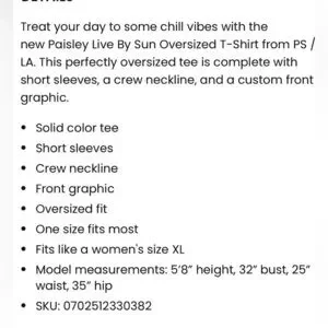 One size. Sold out online! Will fit a S/M/L only!! And it will fit oversized, like in the photo if you are a smaller size. Measurements are in photos. Great for lounging in or pairing with denim jeans/shorts. In good used condition. Please look at photos for all details and measurements. More measurements upon request. Any questions? Please leave them in the comments below and I will get back to you ASAP. I always ship within 1-2 business days. All items come from a clean, smoke, and pet free home! Thanks for looking and please ‘Bundle and Save!’ I give great discounts on all Bundles!