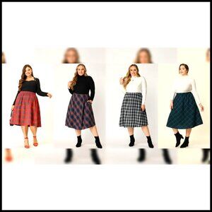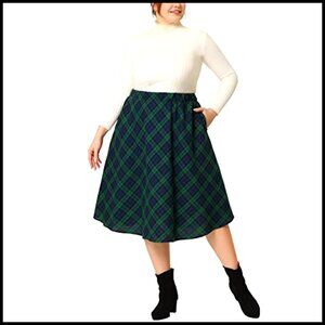 Plus Size A-Line Midi Skirt Elastic Waist Flare Hem Plaid Print