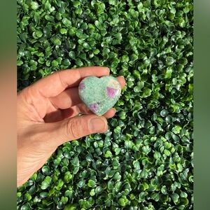Ruby, the stone of courage and vitality, is embedded within the soothing, heart-centered energy of fuchsite, creating a powerful synergy of love, healing, and spiritual growth.