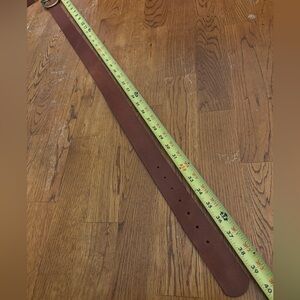 Stylish brown leather belt with a brass buckle, designed for women in a size medium. The belt has a medium width and is crafted from high-quality leather, making it durable and sleek. The brass buckle adds a touch of sophistication to the overall look, making it a versatile accessory that can complement various outfits. Perfect for adding a fashionable touch to any wardrobe, this belt is a must-have accessory for any fashion-forward woman.
