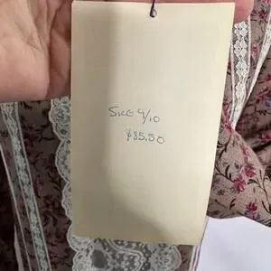 Back zipper. Drop waist. Ivory lace details. Light brown fabric with small pink rose details. New with tags, never worn. Juniors size 9 /Womens size 10.
