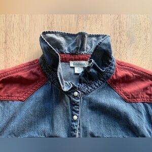Chic denim shirt with bold red accents. Features button-down front and chest pockets. Ideal for casual wear. Sundance size small. 100% cotton. In great condition.