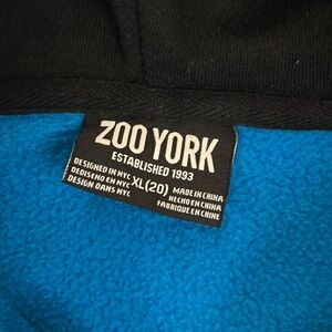 Zoo York Zip Up Graphic Sweatshirt. Blue & Black with embroidered logo graphic. Long Sleeve. Color is Teal Blue as in closeup photo of logo.
