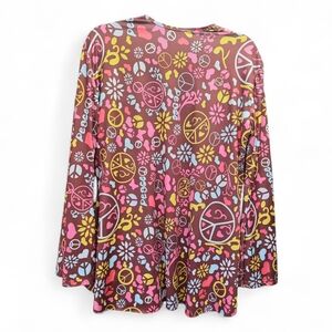 Boho Hippie Peace Sign Fringe Shirt Brown Flower Power Long Sleeve Festival 70s. Boho hippie peace sign fringe shirt is a standout retro inspired piece with serious festival energy. This shirt features all over peace sign & flower power print in pink, white, yellow, and blue. Attached faux suede style fringe panel at front for a layered look, long sleeves with a flared cuff. Flowy and comfortable.