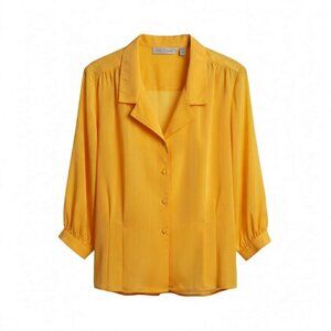 Add a pop of vintage sunshine to your wardrobe with this classic Laura & Jayne Collection blouse! This vibrant mustard/goldenrod yellow top features a sophisticated notched camp collar and elegant vertical pleating down the bodice. The 3/4 length "balloon" style sleeves with gathered cuffs give it a beautiful, flowy silhouette. Perfect for a retro "office-core" look or pairing with your favorite denim.