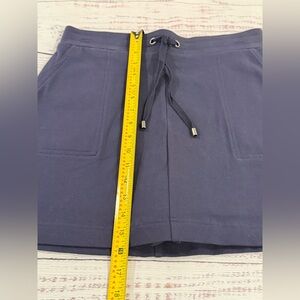 Chic dark blue mini skirt with drawstring waist. Features front pockets for added style.