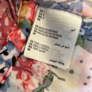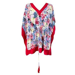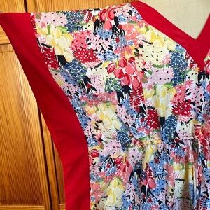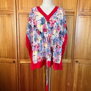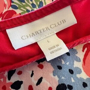 This Charter Club size large top is a vibrant and eye-catching piece with a unique kimono-inspired style. While it has the flowy, relaxed fit of a kimono, it does feature defined armholes for ease of wear and comfort. The top showcases a bold, colorful floral print accented by solid red trim, giving it a striking contrast that stands out beautifully.