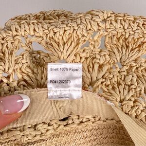 Notable features: Structured flat crown, open weave crochet brim, thin brown cord tie band, interior grosgrain sweatband