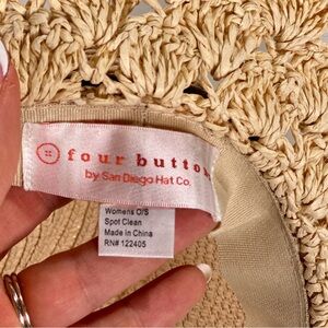 Four Buttons by San Diego Hat Co. women’s wide brim straw sun hat with a structured flat crown and decorative open crochet brim in a natural neutral tone. The tightly woven paper straw crown provides shape and structure, while the open lattice brim adds texture and breathability for warm weather wear.