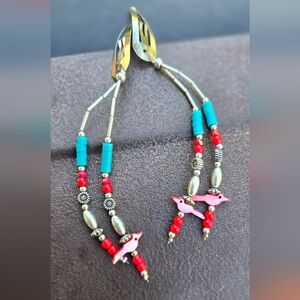 Vibrant colors and oh, so fun!!!! Silver barrettes with tassles attached to them made with silver beads of different shapes and styles, turquoise beads, and sparkling faceted rainbow sheen red beads, sunflower beads, pink dyed shell heishi bird beads. PLEASE NOTE, one bird is missing from one if the dangles. Not noticable when worn.