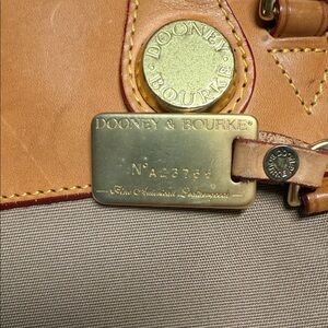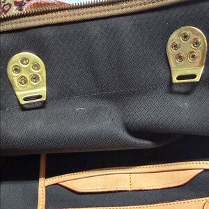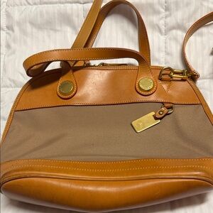 Elegant tote with tan leather accents. Features secure buckle closure. Ideal for professional use.