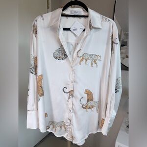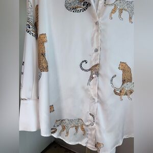 Casual button-down shirt with leopard illustrations. Adds a unique touch to any outfit.
