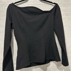 Elevate your wardrobe with this elegant black off-shoulder blouse. Perfect for any occasion, it offers a sleek and stylish look. It’s similar to third picture.