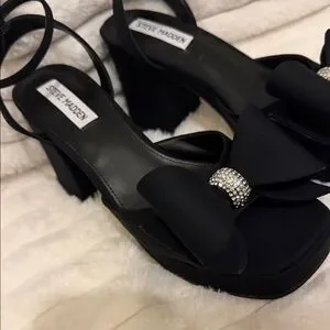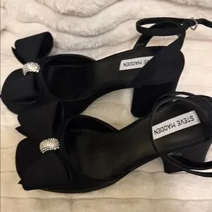 Chic black heels by Steve Madden. Features a bold bow and sparkling rhinestone detail. Ideal for stylish outings.