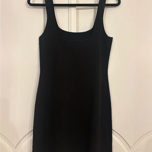 Chic black mini dress by J. Crew. It’s a great staple for any wardrobe and can be dressed up or down. Unclear if exact material but has the viscose/rayon style that hugs your curves and makes for a sexy staple piece!