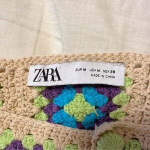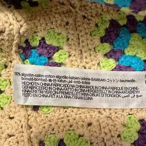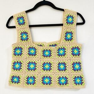 Chic crochet crop top with vibrant patterns. Features blue, green, and cream hues. Ideal for a stylish look.