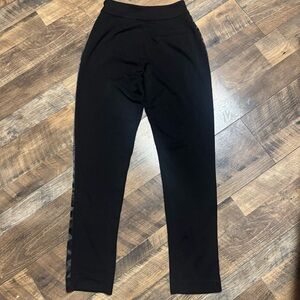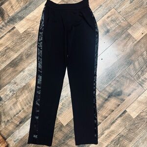 Elegant black pants with sleek satin accents. Ideal for a sophisticated style. These are absolutely stunning with the satin racing stripe on the sides. Side zipper closure. Super soft material. Excellent pre-loved condition. Please let me know if measurements are needed.