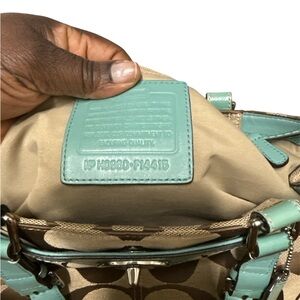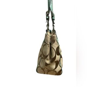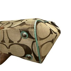Stylish Coach shoulder bag with signature canvas. Features brown and mint accents. Perfect for everyday use. Euc, all 4 corners has rubbing.