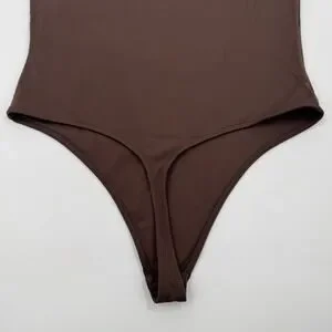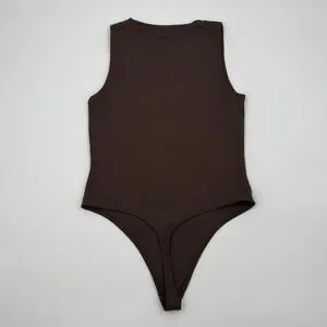Babaton Contour Crew Bodysuit in a rich dark brown coffee shade offers a sleek, second-skin fit. Crafted from the brand\'s signature high-stretch Contour fabric, this sleeveless piece features a classic crew neckline and a thong-cut bottom with snap closures for a seamless look under any outfit. The double-layered construction provides a smoothing effect and opaque coverage, making it a versatile essential for layering or wearing on its own.