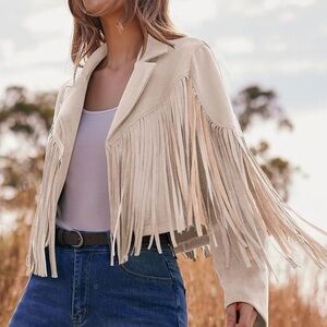 Step up your fashion game with this elegant cream high quality high quality faux suede blazer, featuring eye-catching fringe details. Ideal for adding sophistication to any ensemble.