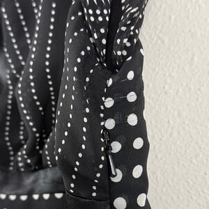 Keywords: geometric blouse, polka dot, empire waist, flutter sleeves, ribbon tie, black & white, office wear, professional, versatile, chic