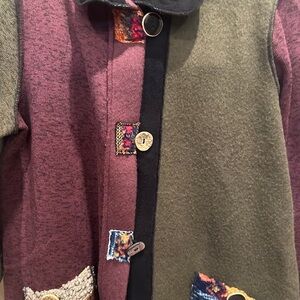 Embrace unique style with this colorful patchwork women's sweater. Featuring a blend of green and purple hues, this sweater adds a vibrant touch to any wardrobe. Perfect for staying cozy and stylish.