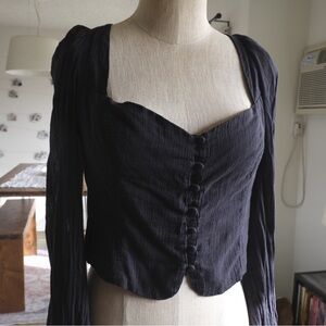 Features: Sweetheart neckline, smocking at back, cropped silhouette, tie closure at back, textured sleeve detailing
