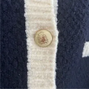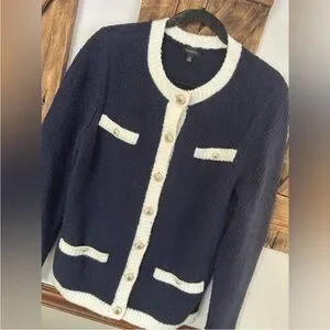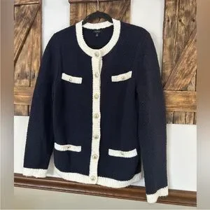 Chic navy cardigan by Talbots with cream accents. Features gold button front and pocket details. Ideal for layering.