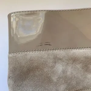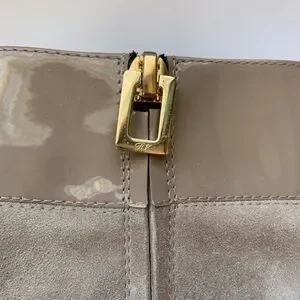 Never worn. Beautiful booties in pristine condition. Striped suede/patent leather. Beige, two and a half inch heels. Size 6.