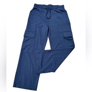 New comfortable navy cargo pants by Nocturne. Experience the perfect blend of comfort and urban edge with these spacious wide leg cargo pants with a thick banded elastic drawstring waist. Functional 10" side pockets with flaps add both style and practicality.