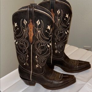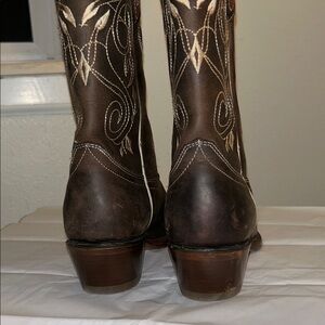 Stylish brown cowboy boots with intricate embroidery. Perfect for a western look.