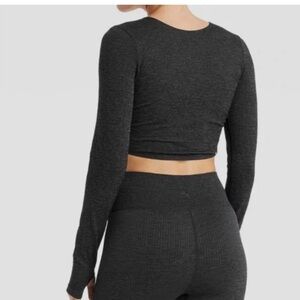 Chic black crop top with twist front. Long sleeves add elegance.