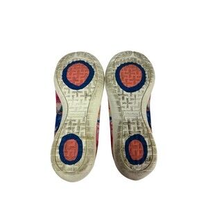 Skechers women’s air cooled flats in US size 7. Multicolor floral print textile upper with round toe and slip-on design. Air-Cooled Memory Foam foam insole with cushioned comfort and a flexible rubber outsole. Fabric lining and heel pull tab. Suitable for casual, travel, and everyday wear. Pre-owned with some discoloration on the soles.