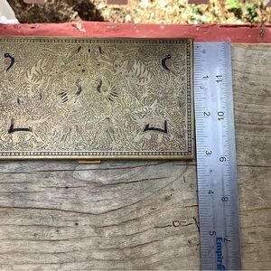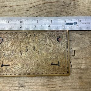 A lovely gold tone,etched design on front and back cigarette case from the 1950s. Produced by Volupte Mid Century. Design is worn down, Case has a lot of patina. Design was originally enameled Asian animal theme, etched on front and back. Very worn down now but a great piece.