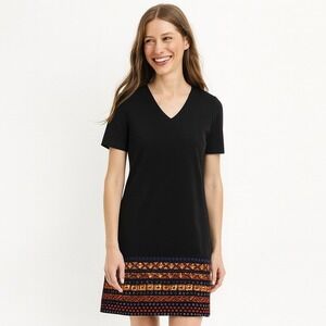 Sweet, Aztec-inspired casual dress. Grandmacore. 90s. Little black dress with Southwestern flair.