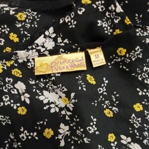 Black floral cami blouse/top with yellow and white flowers, raw lace trim, adjustable spaghetti straps, flowy lightweight material, Princess Vera Wang size medium.