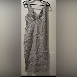Chic gray striped midi dress by Reformation. Features a sleeveless design and elegant fit. Ideal for versatile styling.