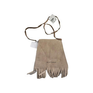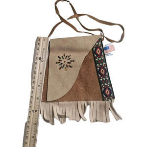 This beautiful leather shoulder bag from Bloom Brothers features exquisite beaded accents and fringe detailing. The bag is X-small in size and has a natural tan exterior with a tan leather lining. The handle and strap are also made of leather and are beige in color.