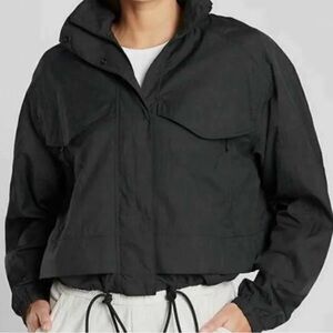 Chic Athleta utility jacket with a high collar. Features a drawstring hem and button closure. Ideal for versatile styling.