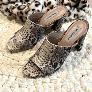 Chic snake print design. Open toe. Block heel. Perfect for any occasion.