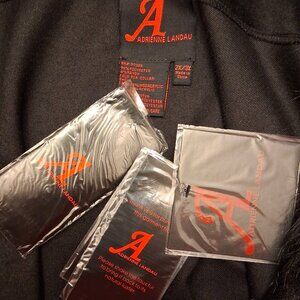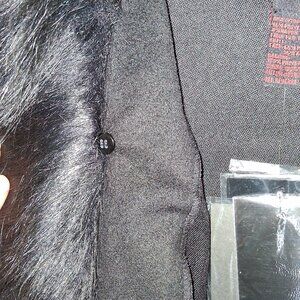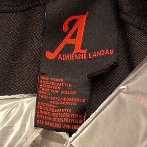 Elevate your outwear with this luxe faux fur cape by Adrienne Landau. Brand new with tags, this timeless black poncho designed for versatile styling, warmth and sophistication. Size 2x-3x generous comfortable fit. Signature removable faux fur collar - dress it up for formal occasions or keep it simple for everyday chic. Three hook-and-eye front closures, single button on each side with an elegant rounded hemline. Made of soft polyester outer shell with faux fur collar trim composed of acrylic and polyester blends, warm yet lightweight.