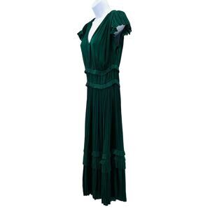 Current Air by Anthropologie green Sereia pleated midi dress for women, size small. This dress features a V-neckline, flutter sleeves, and pleated detailing throughout. Designed with ruffled tiers and a flattering midi silhouette, it offers a chic and feminine look. The pullover styling ensures easy wear, making it perfect for both casual and dressy occasions.
