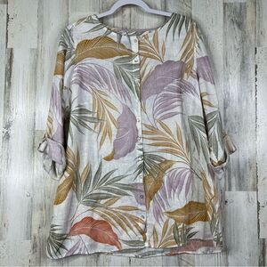 Tahari Linen Shirt Womens Sz 1X Floral Leaves Print