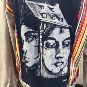 You’ll turn heads and get asked where you got this one- of-a-kind hand -painted mixed fabric denim jacket! With a one-of-a- kind embroidered flamingo on the sleeve, a hand painted piece of art that can be…well- what do you think this piece of art represents? What a great conversation starter!